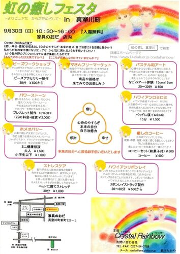 2012年 9/30(日) 10:30~16:00 入場無料 場所 家具のおだ 詳細はコチラ→http://www14.plala.or.jp/crystalrainbow/ 予約は必要ありません。 当日、ブースが混雑した場合は順番にお呼びするカタチになりますので ご了承くださいませ 癒しのコーヒー目の…