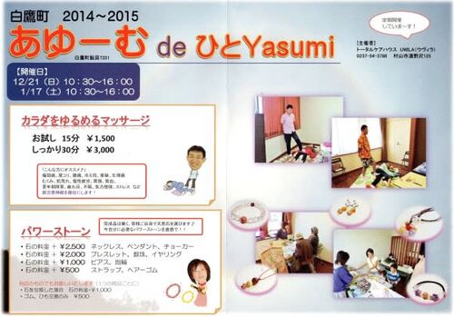 1/17(土) 10:30~16:00 白鷹町 あゆーむ ミーティング室にて カラダをゆるめるマッサージ お試し15分 ¥1,500 しっかり30分 ¥3,000 こんな方にオススメ偏頭痛、肩コリ、腰痛、冷え性、便秘、生理痛、むくみ、肌荒れ、慢性疲労、胃弱、貧血、更年期障害…