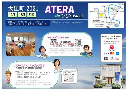 2021年 11月14日(日) 10:30~16:00 ATERA 2階ホール 入場無料♪ カイロプラクティック イベント特別価格になります♪ ・骨盤調整 ¥2,000 ・全身メニュー(骨盤調整含む) ¥4,000 ◎全身 初回の方はイベント特別価格 ¥3,000 その他お好みのメニューをお…