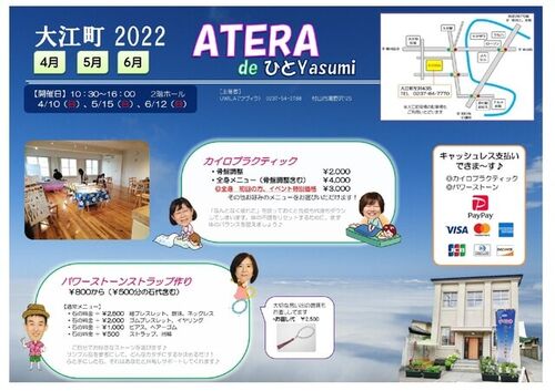 2022年 4月10日(日) 10:30~16:00 ATERA 2階ホール 入場無料♪ ※4/10は、カイロプラクティックはお休みとなります ※4/10は、カイロプラクティックはお休みとなります カイロプラクティック イベント特別価格になります♪ ・骨盤調整 ¥2,000 ・全身メニュ…