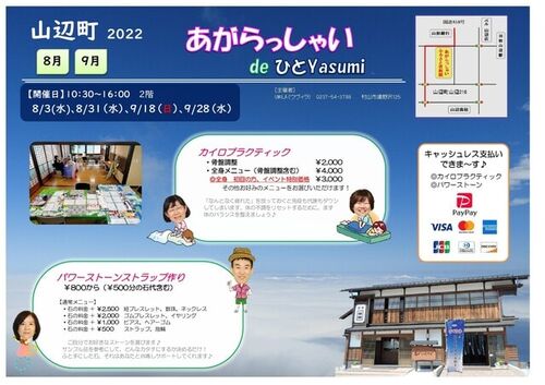 2022年 9月18日(日) 10:30~16:00 あがらっしゃい(山辺町)入場無料 パワーストーン 【体験メニュー】 ・ストラップ作り体験 ¥800から(¥500分の石代含む) 【通常メニュー】 ・石の料金+ ¥2,500 紐ブレスレット、数珠、ネックレス、ペンダント・…