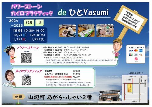 2024年 12月18日(水) 10:30~16:00 あがらっしゃい(山辺町)入場無料 カイロプラクティック イベント特別価格になります♪ ・骨盤調整 ¥2,000 ・全身メニュー(骨盤調整含む) ¥4,000 ◎全身 初回の方はイベント特別価格 ¥3,000 その他お好みのメニュ…