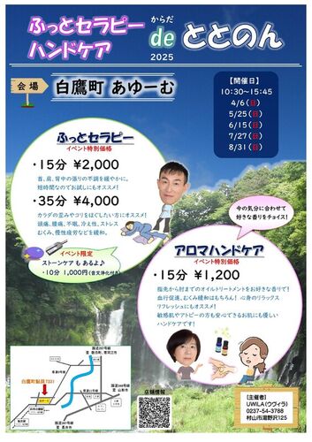 カラダと心を整える「ととのん」で、ごゆっくりお過ごしください 日時 2025年4月6日(日)10:30~15:45 場所 白鷹町 あゆーむ ミーティングルーム ふっとセラピー イベント特別価格 15分 ¥2,000 首、肩、背中の張りの不調を緩やかに。短時間なのでお試し…